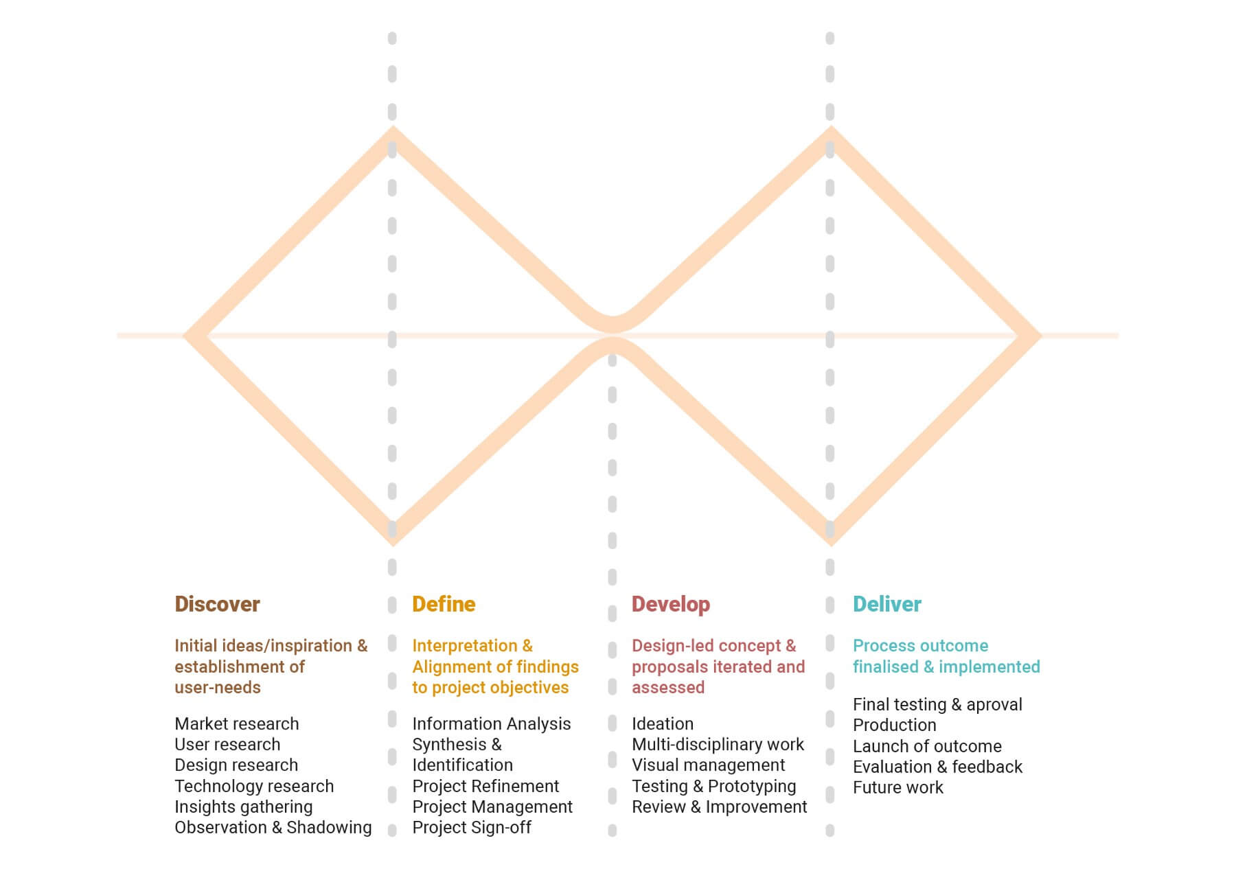 カレンダーは、考えてみると簡単なアプリに思えるかもしれませんが、1度調査を始めれば、このトピックが混乱の元になることがよくわかるはずです。カレンダーを使用する際のユーザー体験を改善するための方法論は:ダブルダイアモンドと呼ばれる手法で、私が1週間かけてリサーチし、また1週間をかけて最終的なプロトタイプを作り出しました。