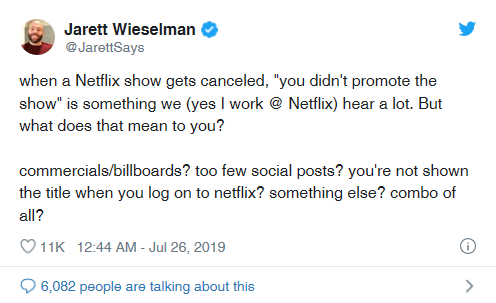 数か月前、NetflixのJarett Wieselmanは、「Netflixは(キャンセルされた)ショーを宣伝しなかった」と言ったときの意味を尋ねる次のツイートを送りました。
